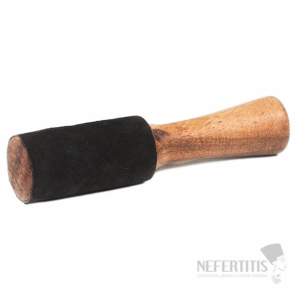 Wooden mallet with black suede for singing bowls. Play your bowl with gentle tones that will calm your mind and help you relax. Size approx. 3.5 x 17 cm, weight approx. 95 g. Material: wood, suede. Illustrative image, you are buying a natural material, the color and pattern of which may differ from the image, but you will always receive a mallet of comparable quality.