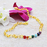 Charming and very attractive chakra amber teething beads for children made of polished larger round baroque pieces of lemon amber in a beautiful lemon yellow color combined with round beads according to the colors of the chakras - amethyst, lapis lazuli, blue quartz, malachite, yellow ulexite, cognac golden amber and cherry red amber. The beads and ambers are about 6 - 7 mm in size. The combination of lemon amber and distinctive chakra colors creates a beautiful impression, the beads are cheerful and will put a smile on your child's face. Bead treatment: polished surface, smooth velvety to the touch, evoking pleasant sensations of a warm surface. Length of beads approx. 32 cm. Safety lock. The wearing of amber beads by children is a traditional thing in Europe, especially during the teething period. Illustrative image.