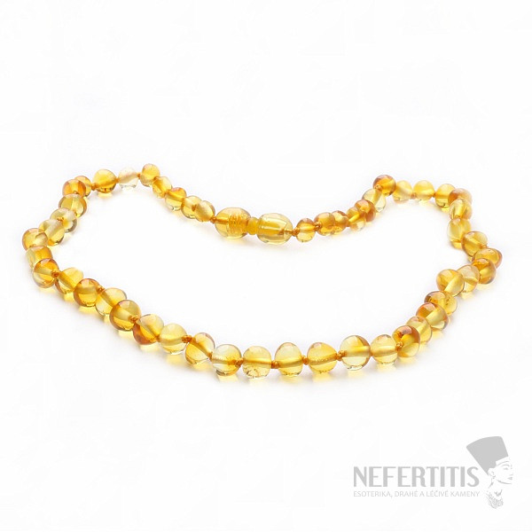 Charming natural amber teething beads for children made from round pieces of beautiful golden honey colored amber, polished to a high shine which gives these beads a sparkling and luxurious look. Like when the sun shines... The pieces of amber are of the "baroque" type, i.e. polished pieces, which with their round shape resemble round beads. If you want something better than "regular" baby beads, then it's worth considering these exceptionally beautiful amber beads. Length of beads approx. 28 cm, size of pieces of amber approx. 4 to 7 mm. Safety lock. Since some parents require a closure other than a screw cap, we are one of the few to offer a so-called pop-up safety cap that does not screw, only the ends of the closure are tucked into each other and open with a little more force, when it is enough pull the two parts of the cap apart. This safety closure is important for situations where the child accidentally catches something with the necklace and continues to pull it, then the closure opens and automatically prevents possible injury to the child. On the other hand, with this type of closure, compared to screw-on closures, even greater adult supervision is required, as a child could use the necklace as a toy and shove the unfastened beads into their mouth. The wearing of amber beads by children is a traditional thing in Europe, especially during the teething period.