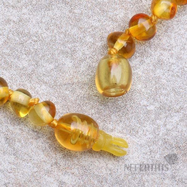 Amber beads for children are made of natural round polished amber, have a screw cap made of polyresin (i.e. nickel-free) and each bead is secured separately with a knot in case of breakage (beads do not all fall out).