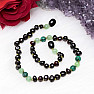 Charming and very attractive amber teething beads for children made of polished larger round baroque pieces of cherry-colored amber with malachite and ulexite (synthetic cat's eye) . The combination of cognac-colored amber and distinctive gemstone colors makes a beautiful impression, the beads are cheerful and will put a smile on your baby's face. Bead finish: polished surface, smooth velvety to the touch, evoking pleasant feelings of a warm surface. Bead length approx. 32 cm. Screw cap. Wearing amber beads by children is a traditional thing in Europe, especially during the teething period. Illustrative image.