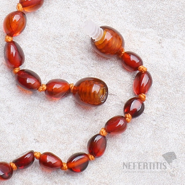 Amber beads for children are made of natural round polished amber, have a screw cap made of polyresin (i.e. nickel-free) and each bead is secured separately with a knot in case of breakage (beads do not all fall out).