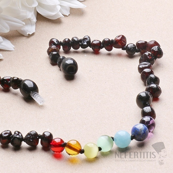 Charming and very attractive chakra amber teething beads for children made of polished larger round baroque pieces of amber in the color of cherry combined with round beads according to the colors of the chakras - amethyst, lapis lazuli, blue quartz, green ulexite, yellow ulexite, orange and cherry red amber. The combination of amber in the color of cognac and the distinctive colors of the chakras creates a beautiful impression, the beads are cheerful and will put a smile on your child's face. Bead treatment: polished surface, smooth velvety to the touch, evoking pleasant sensations of a warm surface. Length of beads approx. 32 cm. Screw cap. The wearing of amber beads by children is a traditional thing in Europe, especially during the teething period. Illustrative image.