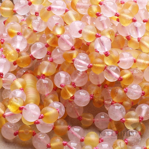 Charming natural amber teething beads for children made of round pieces of satin amber in a beautiful honey color with natural rose gold beads. The pieces of amber are of the "baroque" type, i.e. polished pieces, which… more »