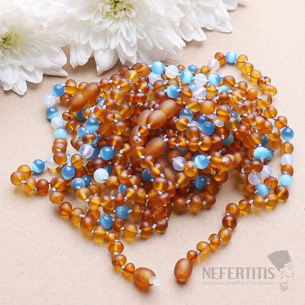 Charming and very attractive teething amber beads for children made of satinized larger round baroque pieces of amber in the color of cognac combined with round beads of opalite and blue ulexite. The combination of amber in the color of cognac and the iridescent play of ulexite and opalite creates a beautiful impression, the beads are cheerful and will put a smile on your child's face. Bead treatment: satin surface, smooth velvety to the touch, evoking pleasant sensations of a warm surface. The length of the beads is approx. 31.5 cm. Screw cap. The wearing of amber beads by children is a traditional thing in Europe, especially during the teething period. Illustrative image.