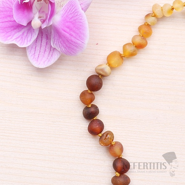 Charming and very attractive Rainbow multicolor amber beads for children on teeth made of satin-shaped larger round pieces of amber, composed of the so-called Rainbow - a rainbow design of three different colors of amber - from light honey to a beautiful deep brown color of ripe cognac. Compared to "ordinary multicolors", these beads are exceptional not only in larger sizes of amber pieces (approx. 4 mm to 7 mm), which are carefully selected so that they are roughly the same size, but above all by their regular stacking into continuous colored sections. This colorful composition and the more regular shape of the amber-like pieces of amber make this children's necklace an almost "adult" gorgeous piece of jewelry. Bead finish: satin finish, smoothly velvety to the touch, evoking a pleasant warm surface. Bead length approx. 32 cm. Screw cap. The wearing of amber beads by children is a traditional matter in Europe, especially during the period of pruning.