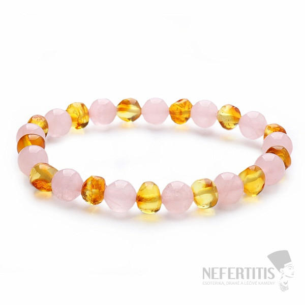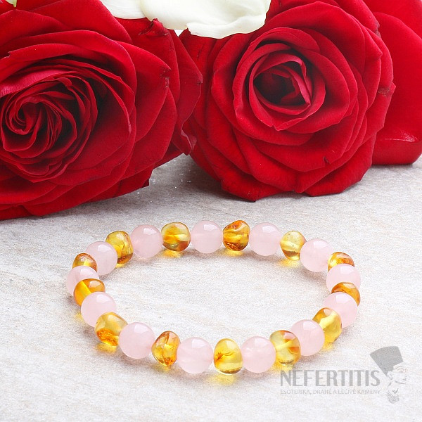 Charming and attractive honey-colored amber bracelet with rose gold. The bracelet is made of polished pieces of honey-colored amber combined with round beads of rose gold. The rose gold beads are approx. 8 mm in size, the amber pieces are approx. 7 - 8 mm in size, strung on a high-quality, neutral-colored nylon elastic band. The combination of amber in contrast with rose gold is very distinctive and attractive. Rosary is a talisman of love, beauty and healing. Illustrative representation of natural material, where the color and structure of the stone may differ from the accompanying photos. However, you will always receive a bracelet of comparable quality.