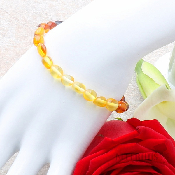 A charming bracelet made of polished round olive-shaped pieces of multicolor natural amber . The bracelet is composed of amber of three colors - honey, cherry and cognac tones, put together in a so-called Rainbow design. Polished pieces of amber give the bracelet a shimmering appearance in flashes of light. This type of amber beads, in addition to its beautiful color and shape, is very pleasant to the touch, it has an almost velvety and warm feeling on the skin. Pieces of amber are strung on high-quality elastic nylon thread. Illustrative image.