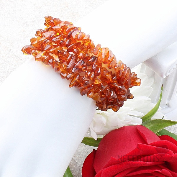 Charming wrap bracelet made of polished round pieces of natural amber in the color of cognac. Polished pieces of amber give the bracelet a shimmering appearance in flashes of light. This type of amber beads, in addition to its beautiful color and shape, is very pleasant to the touch, it has an almost velvety and warm feeling on the skin. Pieces of amber are strung on a flexible memory wire. Illustrative image.