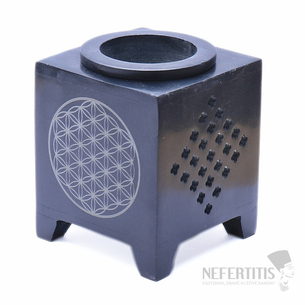 Beautiful, aroma lamp made of talc black with the Flower of Life, which symbolizes all the sacred energy on Earth. It includes a body aroma lamp and a bowl of essential oils. It is also possible to put fragrant wax in the bowl. Let the sacred energy flow along with the popular scent, which suppresses negativity, tension and stress and positively affects your senses. Size 7.5 x 7.5 x 10 cm.