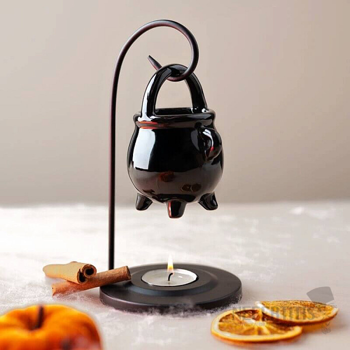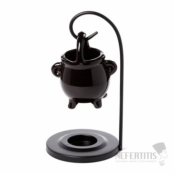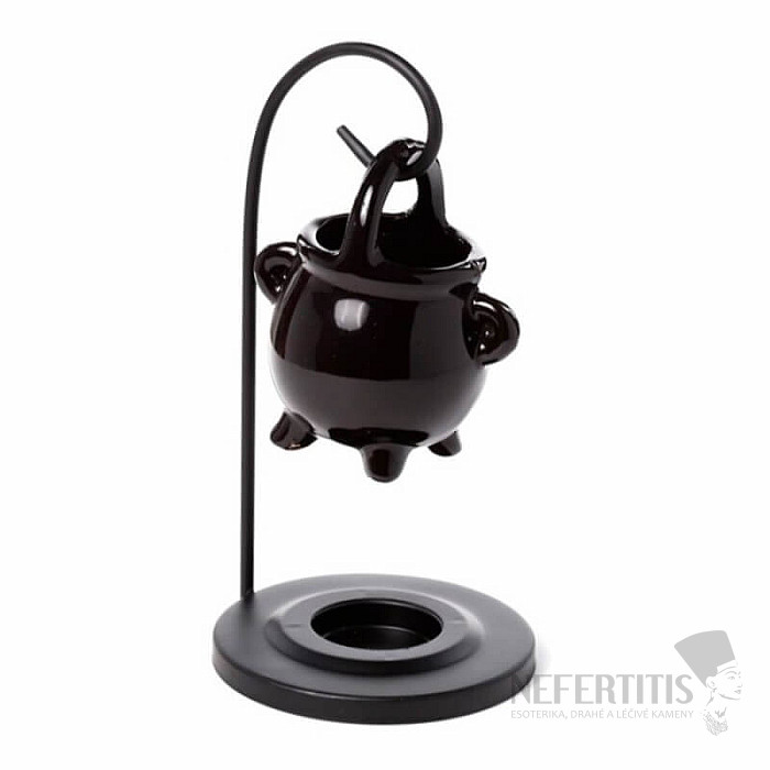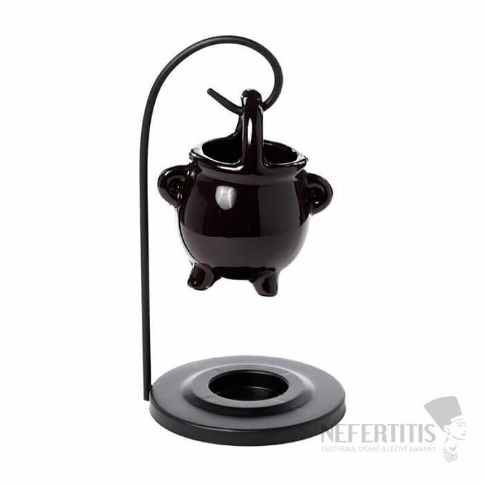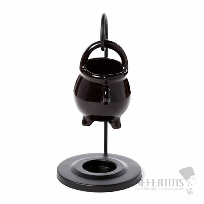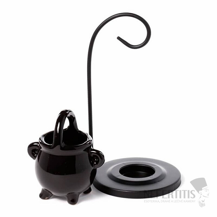 Aroma lamp made of bone china in the form of a black hanging cauldron, for a tealight. Material: bone china, metal. Total height approx. 17 cm, kettle height approx. 8.5 cm. Illustrative illustration. Tealight not included.