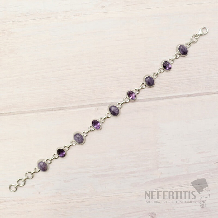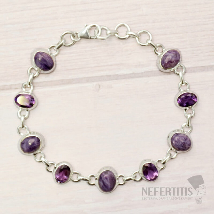 Silver bracelet with beautiful quality charms and cut amethysts. The beautifully purple colored charms will enchant you not only with their silky shine, but also with the transformation of the drawing in the changing light. Ag 925. You are purchasing the jewelry pictured directly.