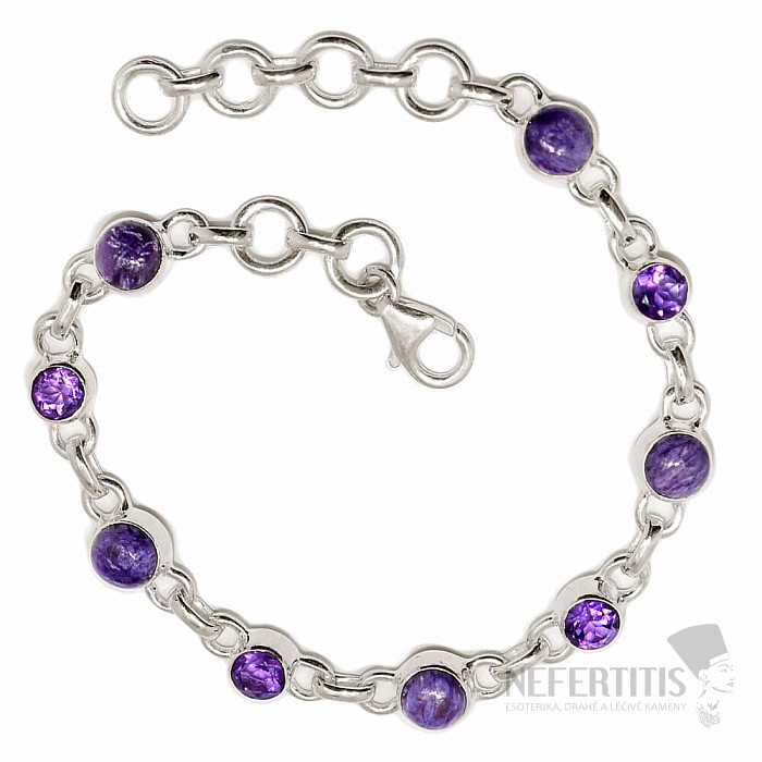 Silver bracelet with beautiful quality charms and cut amethysts. The beautifully purple colored charms will enchant you not only with their silky shine, but also with the transformation of the drawing in the changing light. Ag 925. You are purchasing the jewelry pictured directly.