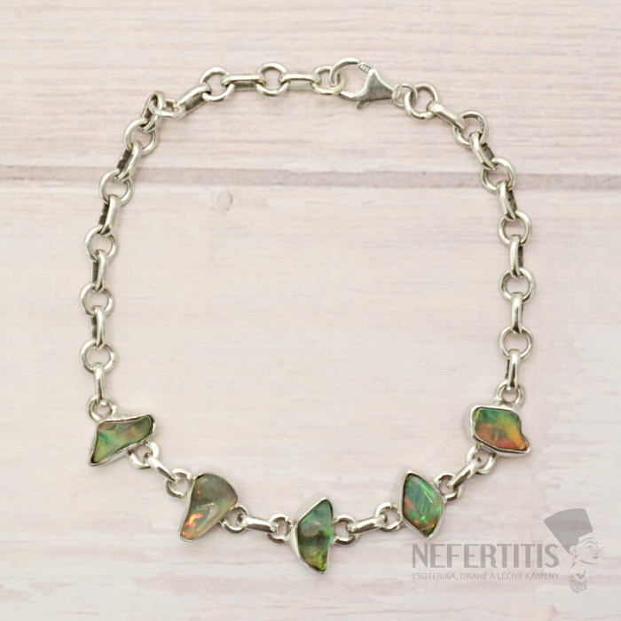 A beautiful and elegant bracelet made of raw, polished opal. An impressive and elegant piece of jewelry, evoking joy and feelings of harmony at first glance. Ethiopian opals, compared to Australian opals, literally burst with neon-bright reflections of colors. Although they don't look like it at first glance, the fireworks of colors that burst from the opals in this bracelet with every movement of your hand will enchant not only you, but all those around you. Ethiopian opals have different colors under different angles of light, they are such "stone chameleons". Silver Ag 925. You are buying the jewelry pictured.