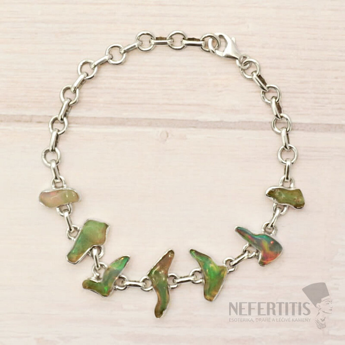 A beautiful and elegant bracelet made of raw, polished opal. An impressive and elegant piece of jewelry, evoking joy and feelings of harmony at first glance. Ethiopian opals, compared to Australian opals, literally burst with neon-bright reflections of colors. Although they don't look like it at first glance, the fireworks of colors that burst from the opals in this bracelet with every movement of your hand will enchant not only you, but all those around you. Ethiopian opals have different colors under different angles of light, they are such "stone chameleons". Silver Ag 925. You are buying the jewelry pictured.