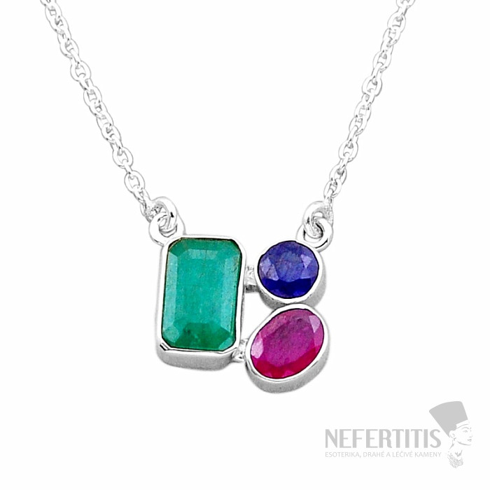 Silver necklace with cut Indian emerald, ruby and sapphire. Ag 925. Indian emerald is a trade name for a natural stone, most often sillimanite or corundum, artificially dyed to the color of emerald. It is therefore not… more »