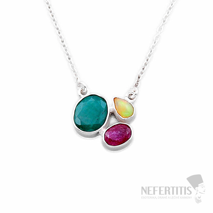 Silver necklace with Indian emerald, Indian ruby and Ethiopian opal. Ag 925.