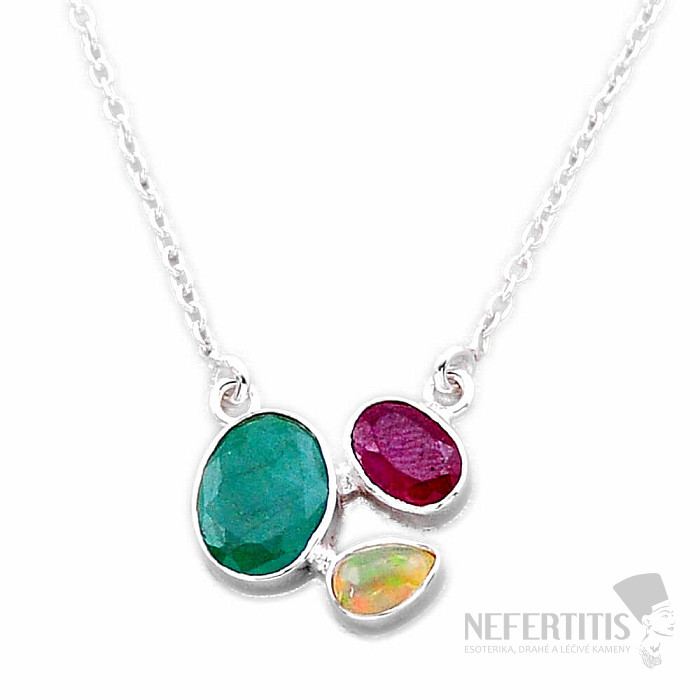 Silver necklace with Indian emerald, Indian ruby and Ethiopian opal. Ag 925.