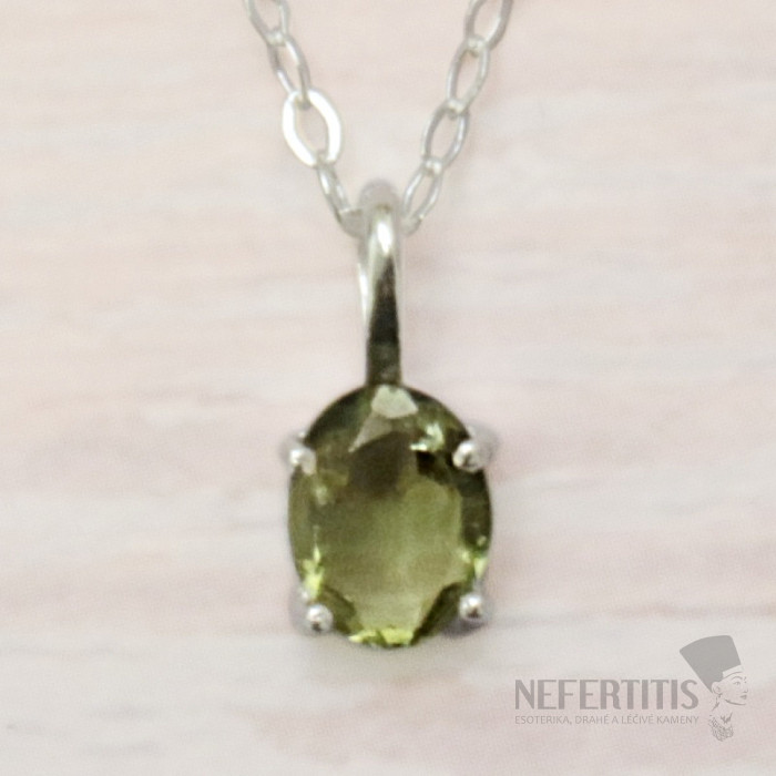 Attractive silver necklace with cut moldavite. Ag 925. You are purchasing the jewelry pictured. Necklace size: length approx. 40.5 cm, can be adjusted up to 45.5 cm. Stone size approx. 0.7 cm . Moldavite is a glass of… more »