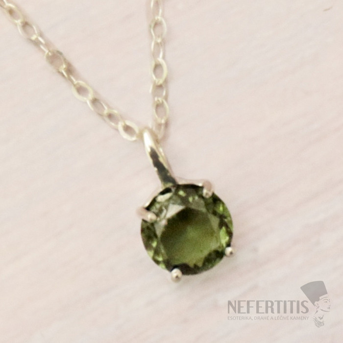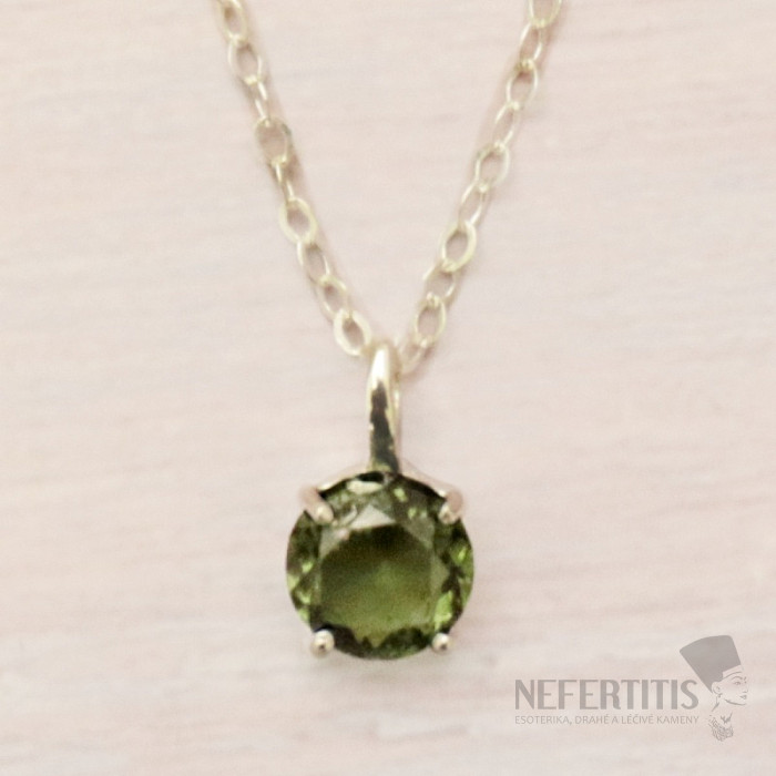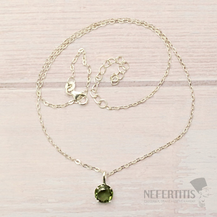 Attractive silver necklace with cut moldavite. Ag 925. You are purchasing the jewelry pictured. Necklace size: length approx. 40.5 cm, can be adjusted up to 45.5 cm. Stone size approx. 0.7 cm . Moldavite is a glass of… more »