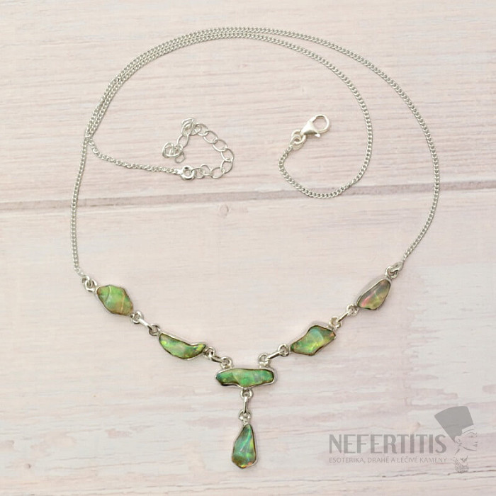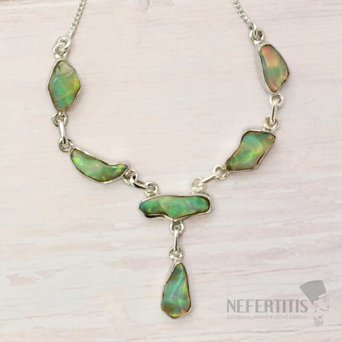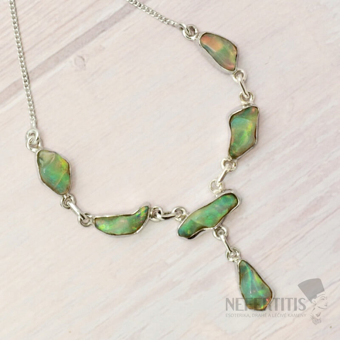 Modern and elegant silver necklace made of raw, polished opal, with a beautiful play of colors - Ag 925. An impressive and elegant piece of jewelry, evoking joy and feelings of harmony from the look. Ethiopian opals, compared to Australian opals, literally luxuriate in neon-bright reflections of colors. Although they don't look like it at first glance, the fireworks of colors that burst from the opals in this necklace with every light hit will enchant not only you, but your entire surroundings. You are buying the jewelry pictured.
