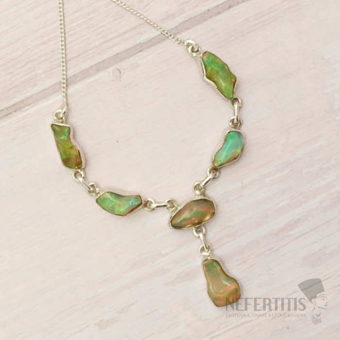 Modern and elegant silver necklace made of raw, polished opal, with a beautiful play of colors - Ag 925. An impressive and elegant piece of jewelry, evoking joy and feelings of harmony from the look. Ethiopian opals, compared to Australian opals, literally luxuriate in neon-bright reflections of colors. Although they don't look like it at first glance, the fireworks of colors that burst from the opals in this necklace with every light hit will enchant not only you, but your entire surroundings. You are buying the jewelry pictured.