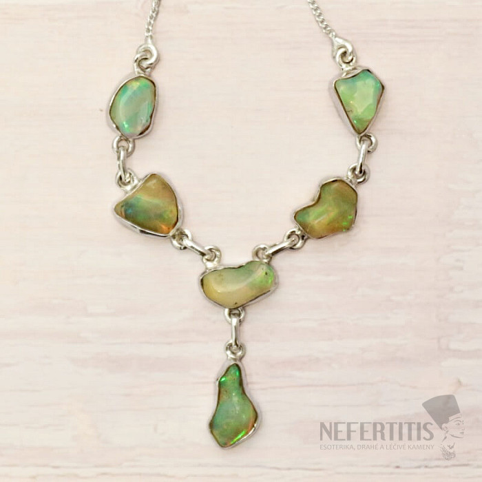 Modern and elegant silver necklace made of raw, polished opal, with a beautiful play of colors - Ag 925. An impressive and elegant piece of jewelry, evoking joy and feelings of harmony from the look. Ethiopian opals, compared to Australian opals, literally luxuriate in neon-bright reflections of colors. Although they don't look like it at first glance, the fireworks of colors that burst from the opals in this necklace with every light hit will enchant not only you, but your entire surroundings. You are buying the jewelry pictured.