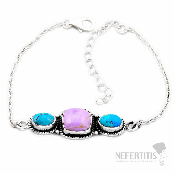 A fun silver bracelet with phosphosiderite and turquoise. Ag 925. Phosphosiderite is a talisman used to support the desire to find a way to change a part of life to a desired state. Purple is the color of intuition, dreams and luxury. The beautifully colored stone will be a decoration for various occasions. You are purchasing the jewelry pictured.