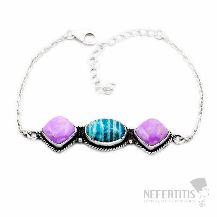 A fun silver bracelet with phosphosiderite and amazonite. Ag 925. Phosphosiderite is a talisman used to support the desire to find a way to change a part of life to a desired state. Purple is the color of intuition, dreams and luxury. The beautifully colored stone will be a decoration for various occasions. You are purchasing the jewelry pictured directly.
