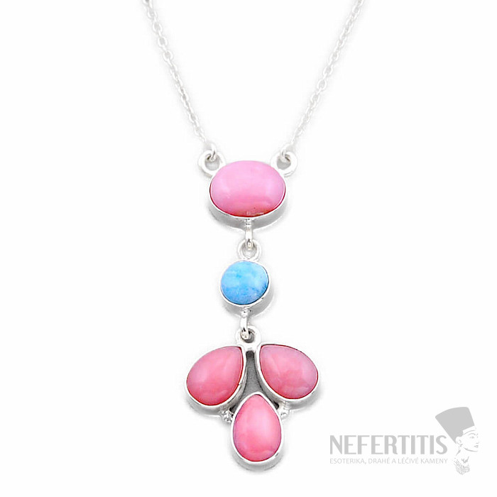 Delicate silver necklace with pink opals and larimar. Ag 925. Pink opal is a talisman of love. Its delicate pink color gives the jewelry its personality. You are purchasing the jewelry pictured.