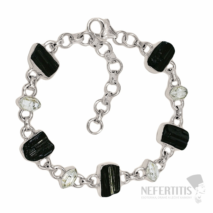 Attractive, elegant, a little mysterious bracelet made of raw black tourmaline skoryl and with herkimer diamonds in silver. The black color of the tourmaline, which beautifully contrasts with the shine of the silver frame, gives this bracelet elegance and makes it a very decorative piece of jewelry. Black raw tourmalines commonly contain cracks, this is their characteristic feature and proof that you are buying genuine natural tourmaline. Ag 925. You are buying the jewelry shown directly.
