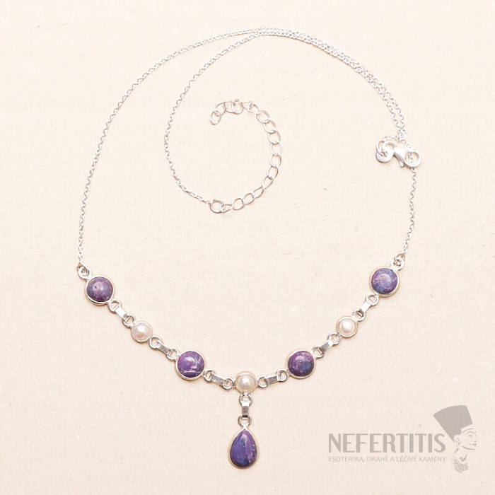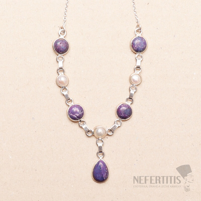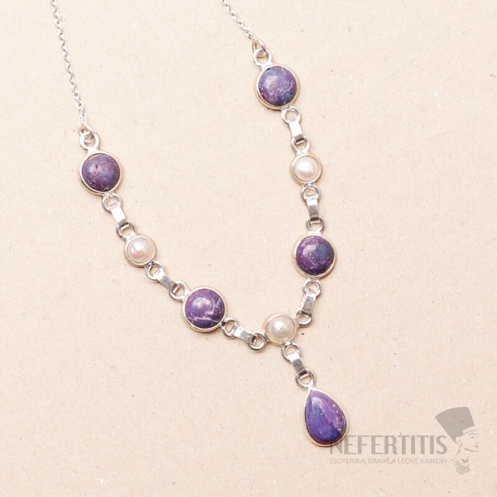 An exceptional silver necklace with cabochons made of pieces of purple turquoise , connected by copper into impressive cabochons of a beautiful purple-violet color. This color is achieved by coloring the stone. This type of jewelry is gaining great popularity in the world due to the ever-increasing price of solid pieces of natural turquoise. The turquoise is complemented by white pearls . A distinctive piece of jewelry that will charm everyone and no one will overlook it on you. Ag 925. You are buying the jewelry shown directly.