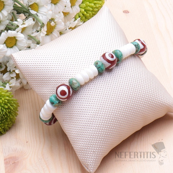 Beautiful author's bracelet made of agate Dzi beads in combination with turquoise and shell. The beads are a faithful copy of the original Tibetan Dzi. This is one of our designer jewelry. Very elegant and distinctive bracelet, suitable for various occasions. The size of the beads is about 10 mm, 8 mm and 6-7 x 1-4 mm, threaded on a quality nylon rubber band of neutral color. Czech handmade.