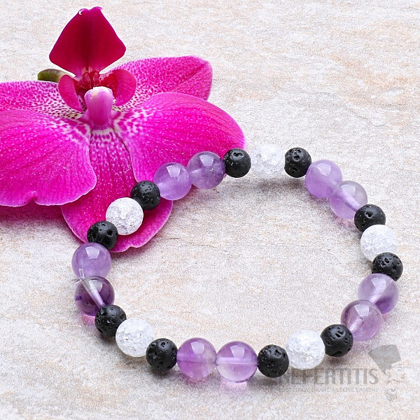 Attractive and distinctive design bracelet made of natural amethyst, lava and cracked crystal. Although cracked crystal already says by its name that there are various cracks in it, it is the most beautiful variant of crystal that exists. It is the number of cracks in the perfectly clean crystal that gives this bracelet a sparkling, diamond-like glittering appearance under the light. This is one of our signature pieces of jewelry. A bracelet with an impressive combination of colors, designed for everyone who likes a distinctive yet elegant style. The size of the amethyst and crystal beads is approx. 8 mm, the size of the lava is approx. 6 mm, strung on a high-quality neutral-colored nylon elastic band. Czech handmade production.