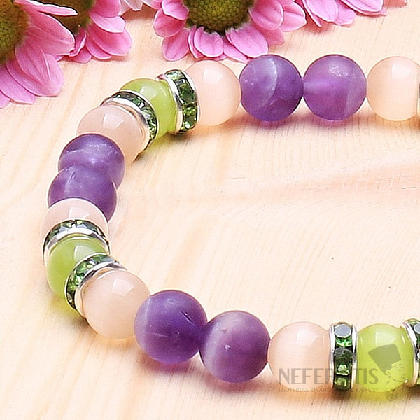 Attractive, cheerful bracelet made of natural satin amethyst with ulexite, with a cat's eye effect. The bracelet is completed with glittering applications in Swarovski style. This is one of our signature pieces of jewelry. A bracelet with an impressive combination of colors, designed for everyone who likes a distinctive yet elegant style. The size of the beads is approx. 8 mm, strung on a high-quality neutral-colored nylon rubber band. Czech handmade production.