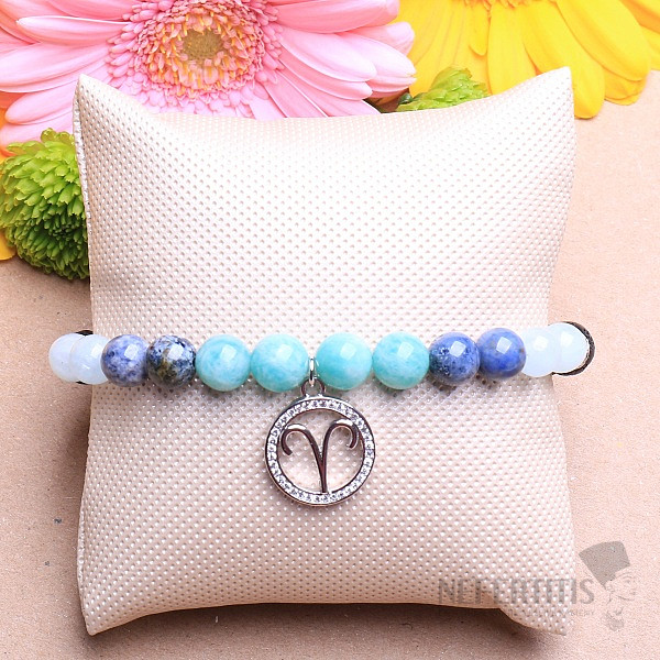 Author's bracelet for people born in the sign of BERAN. The personal stones of Aries have a turquoise color. Typical qualities are combativeness and leadership skills, courage and determination. Rams are easy to learn, have an excellent memory and can say the right things at the right time. They are sincere. Aquamarine, amazonite, dumortierite in combination with lava beads and glittering applications in Svarowski style. The sign of the Zodiac is made of cubic zirconia, which shines beautifully with every movement thanks to the cut surfaces of zircons. This is one of our designer jewelry that you will not find anywhere else. Bead size approx. 8 - 9 mm, strung on a high-quality nylon rubber band of neutral color. Czech handmade.