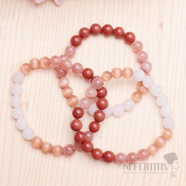 Author's bracelet made of semi-precious stones and ulexite in an orange-red tone. This is one of our signature pieces of jewelry. The bracelet is made of red jasper, sunstone, jadeite and orange ulexite with a cat's eye effect. The size of the beads is 8 mm, strung on a high-quality neutral-colored nylon elastic band. Czech handmade production.