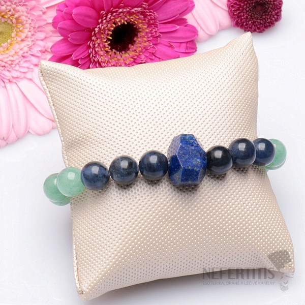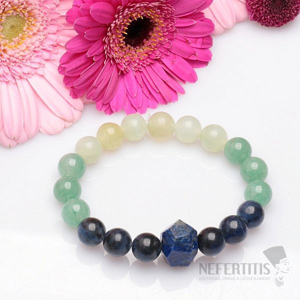 Beautiful author's bracelet in a green-blue variation of semi-precious stones - sodalite, aventurine, jadeite, complemented by a cut crystal of lapis lazuli. This is one of our designer jewelry. Very elegant and distinctive bracelet, suitable for various occasions. The size of the beads is approx. 10 mm, the size of the lapis lazula is approx. 12 - 18 x 12 - 14 mm, strung on a high-quality nylon rubber band of neutral color. Czech handmade.