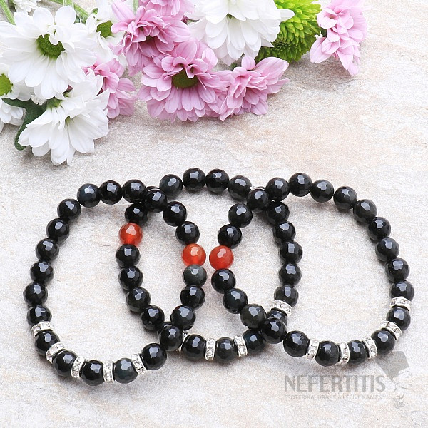 Beautiful designer bracelet made of faceted obsidian beads and faceted carnelian beads. This is one of our signature pieces of jewelry. The bracelet is completed with glittering applications in Swarovski style. An elegant bracelet, suitable for various occasions, which, thanks to the glitter and the striking combination of black and red, no one will miss on your hand. The carnelian bead is intentionally placed asymmetrically to give the bracelet an unusual feel and can be worn on top with either glitter applications or carnelian. The size of the beads is approx. 8 mm, strung on a high-quality neutral-colored nylon rubber band. Czech handmade production.