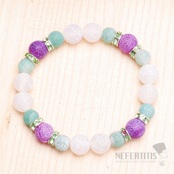 Author's bracelet made of beads of attractive cracked agate of various colors, supplemented with glittering applications in Swarovski style. This is one of our signature pieces of jewelry. A very elegant and distinctive bracelet, suitable for various occasions. The size of the agate beads is approx. 8 and 10 mm, the glittering appliqués are made of base metal, strung on a high-quality neutral-colored nylon elastic band. Czech handmade production.