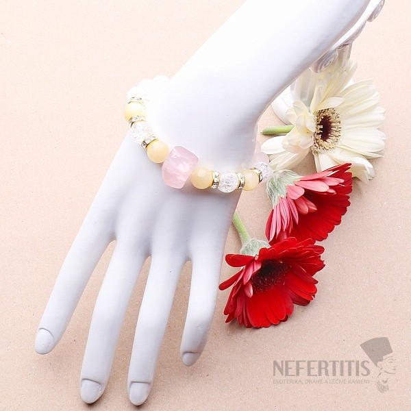 Delicate designer bracelet Crystal love - crystal love made of beads of natural rose gold, jadeite and cracked crystal with a large rose gold in the form of a crystal. This is one of our signature pieces of jewelry. The bracelet is completed with sparkling metal applications in Swarovski style. The size of the beads is approx. 10 mm, the metal beads are made of base metal, strung on a high-quality neutral-colored nylon rubber band. Czech handmade production.