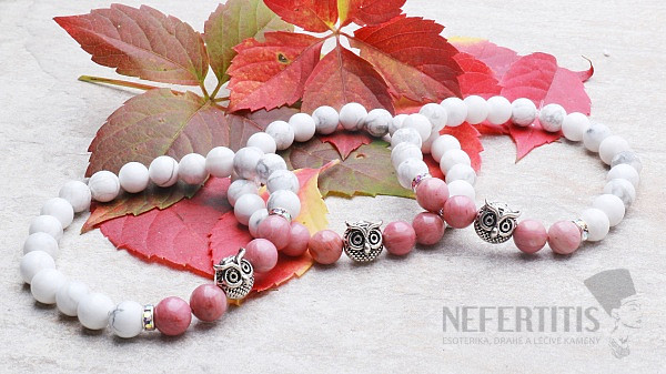 A beautiful, delicate design bracelet made of natural white howlite and rhodonite beads, complemented by a metal bead in the shape of an owl, which has been a symbol of wisdom since ancient times. The bracelet is completed with glittering applications in Swarovski style. This is one of our signature pieces of jewelry. An elegant, delicate bracelet, suitable for various occasions, which, thanks to the striking combination of white and pink colors, will not be overlooked on your hand. The size of the beads is approx. 8 mm, the size of the owl is approx. 10 mm, strung on a high-quality neutral-colored nylon elastic band, the owl is made of common metal in the color of tarnished silver. Czech handmade production.