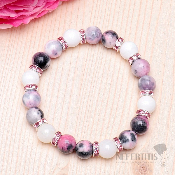 Bracelet in a pink-grey tone made of white and colored jadeite with sparkling applications in Swarovski style. This is one of our signature pieces of jewelry. The size of the beads is approx. 10 mm, the metal applications are made of base metal, strung on a high-quality neutral-colored nylon rubber band. Czech handmade production.