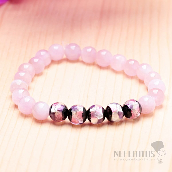 Attractive bracelet made of kunzite beads and foil glass, glass beads with an interesting color effect. An elegant piece of jewelry that brings love into life. This is one of our signature bracelets that you cannot buy anywhere else. The size of the beads is approx. 8 mm, strung on a high-quality old pink nylon elastic band. Czech handmade production. Illustrative depiction of front material, color, shape and size of stones may differ from the accompanying photos.