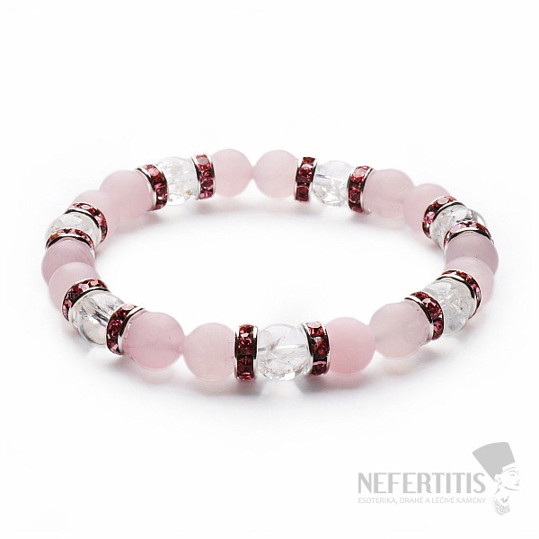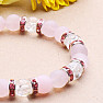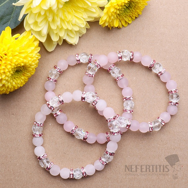 A beautiful designer bracelet made of natural cracked rock crystal beads and satin rose gold, complemented by sparkling applications in the Swarovski style. This is one of our signature pieces of jewelry. Although cracked crystal already says by its name that there are various cracks in it, it is the most beautiful variant of crystal that exists . It is the number of cracks in the perfectly clean crystal that gives this bracelet a sparkling, diamond-like glittering appearance under the light. A very elegant bracelet, suitable for various occasions. The size of the crystal and rosette beads is approx. 8 - 9 mm, the glittering applications are made of base metal, strung on a high-quality neutral colored nylon elastic band. Czech handmade production.