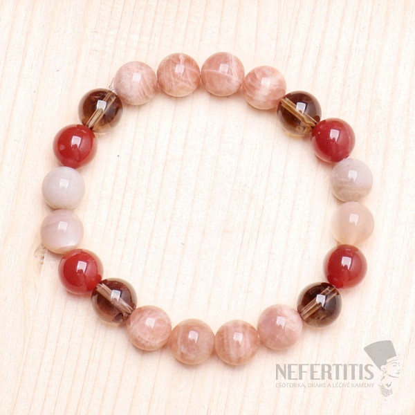 An attractive bracelet made of sunstone, carnelian and agate beads. Another one of our designer jewelry. The size of the beads is approx. 10 mm, strung on a high-quality neutral-colored nylon elastic band. Czech handmade production.
