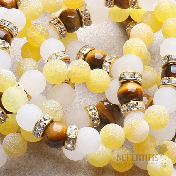 Beautiful design bracelet made of natural tiger's eye beads in combination with yellow cracked agate and jadeite, complemented by glittering applications in Swarovski style. This is one of our designer jewelry. Very elegant and distinctive bracelet, suitable for various occasions. The size of jadeite and agate beads is about 8 mm, glittering applications are made of base metal, strung on a quality nylon rubber band of neutral color. Czech handmade.