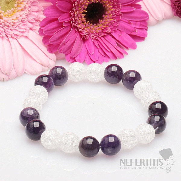 Sparkling crystal and dark purple miracle, that is a unique bracelet made of rare cracked crystal beads and amethyst beads, which is a talisman of love, passion and understanding. Although cracked crystal already says by its name that there are various cracks in it, it is the most beautiful variant of crystal that exists . It is the number of cracks in perfectly clear crystal that gives this bracelet a sparkling, diamond-like look under the impact of light. The combination of crystal and amethyst then gives the bracelet an unusual, unmistakable and attractive look. In addition, the crystal is a stone that enhances the effects of other stones in its surroundings. Bead size approx. 10 mm. Threaded on a rubber band of neutral color. Illustrative image, you will receive a bracelet of comparable quality.