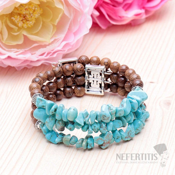 Triple flexible bracelet made of pieces of tyrkenite (reconstructed turquoise) and wooden beads with metal ornaments on a memory wire. Bead size approx. 6.5 mm, metal ornaments are made of base metal. Even lustrative depictions of natural material, color, shape and size of stones and wood may differ from the accompanying photographs.