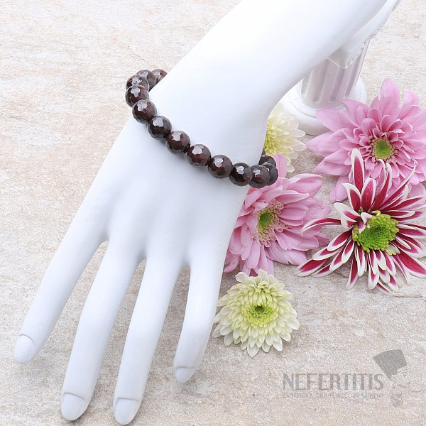 Beautiful, glittering and elegant bracelet made of large faceted garnet beads in extra quality . Let yourself be enchanted by the deep red color of the grenade and with its help bring not only passion into your life, but also energy and vitality to your body and mind. A very decorative jewel that combines the red beauty of a garnet with a shimmering play of light on hundreds of faces of cut beads. Beads with a diameter of about 1 cm are strung on a high-quality red nylon rubber band.